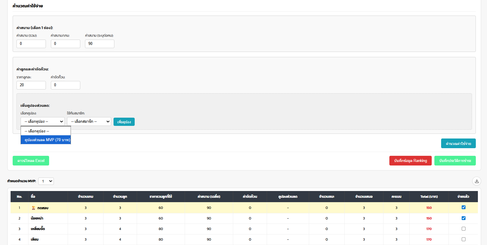 แอดมินสามารถสร้างคูปองส่วนลดสำหรับค่าคอร์ทหรือค่าลูกแบด พร้อมฟังก์ชันบันทึกคูปองเป็นไฟล์รูปภาพเพื่อแชร์ลงกลุ่ม Social Media ได้ทันที